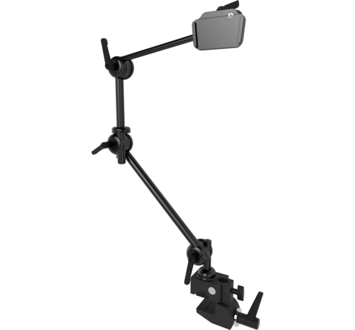 Montagem de mesa com três tubos e três juntas com alavanca. Inclui sistema de adaptação rápida Universal Device Socket (UDS). Braço que permite o posicionamento de vários tipos de hardware, só precisa de escolher o adaptador certo e colocar o seu equipamento na posição correta.