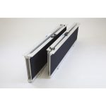 Rampa com bordas de cada lado para evitar que se desloque acidentalmente. As arestas têm 30 mm de altura. A superfície antiderrapante é colada na rampa de metal. Portanto, estas rampas não são adequadas para serem mantidas no exterior e sujeitas a clima exterior.