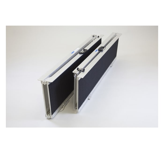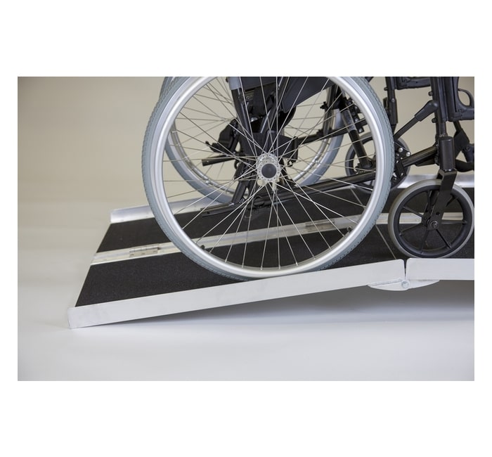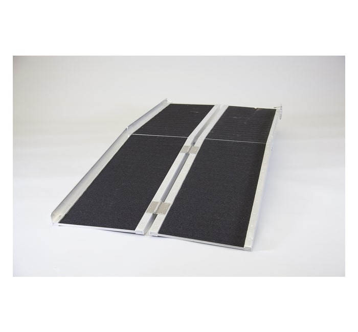 Rampa de cadeira de rodas sólida e durável em alumínio com superfície de aderência preta antiderrapante. Escolha entre comprimentos de 1.2 m, 1.5 m, 1.8 m, 2.1 m, 2.4 m e 3.0 m. A rampa dobra-se ao meio, tanto em comprimento como em largura – de 1.8 m para cima as rampas dividem-se em 2, que tornam as rampas muito mais fáceis de colocar e utilizar.