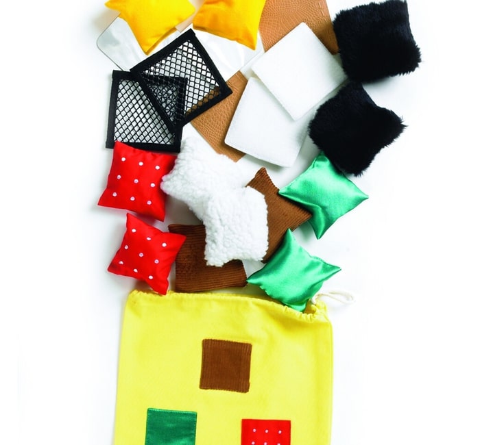 O Saco Texturas contêm 20 pequenos quadrados macios com 10 pares diferentes. Cada par tem a sua própria textura e o seu aspecto diferente.