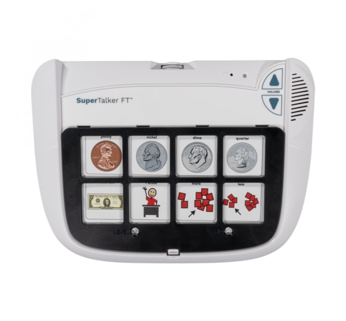 O SuperTalker FT inclui quatro grelhas intercambiáveis que podem ser usados para criar um dispositivo de comunicação com uma, duas, quatro, ou oito mensagens. Contém uma superfície de ativação Feather Touch que é suficientemente sensível para detetar os toques mais leves. Oito níveis de gravação dão-lhe a capacidade de gravar até 64 mensagens únicas.