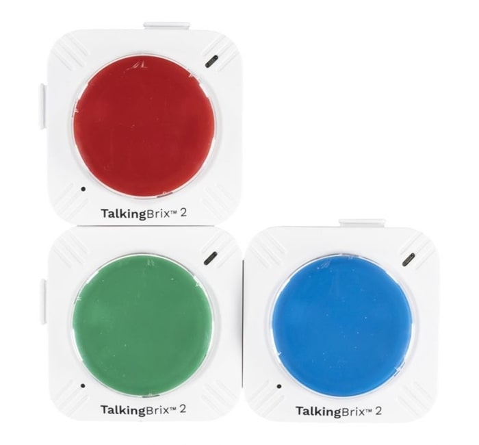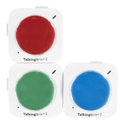 O TalkingBrix é um conjunto de três dispositivos de comunicação de mensagem única que podem ser utilizados individualmente ou anexados para criar um dispositivo de comunicação de várias mensagens. Cada TalkingBrix pode reproduzir uma mensagem até 10 segundos de duração.